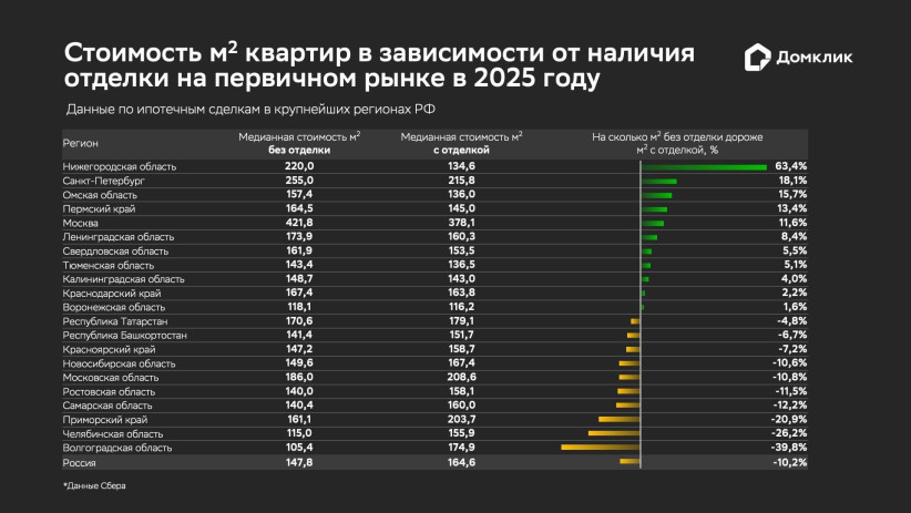 Их выводы подтверждает статистика продаж в ипотеку от Сбербанка: в 2025 году все сделки по приобретению премиальных квартир в Нижегородской и Омской областях пришлись на лоты без отделки. В Свердловской области доля квартир без отделки составила более 80% сделок на покупку высокобюджетных квартир, в Москве — около 70%, а Санкт-Петербурге — 40%.