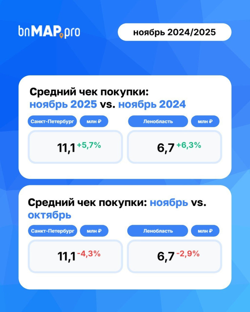 Примечательно, что если анализировать статистику сделок по стоимости квартир, то она в Петербурге отрицательная, констатируют эксперты сервиса bnMAP. Средний бюджет сделки на первичном рынке в ноябре 2025 года составил 11,1 млн рублей. Это на 4,3% меньше, чем в октябре текущего года (11,6 млн рублей), и на 5,7% больше, чем в ноябре 2024-го (10,5 млн рублей). В Ленобласти в ноябре средний чек за квартиру составил 6,7 млн рублей: минус 2,9% к октябрю.