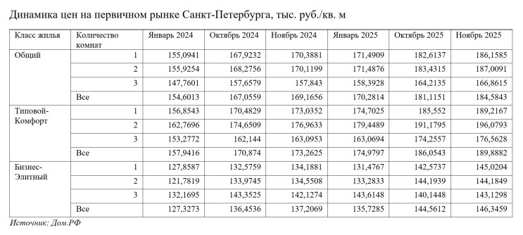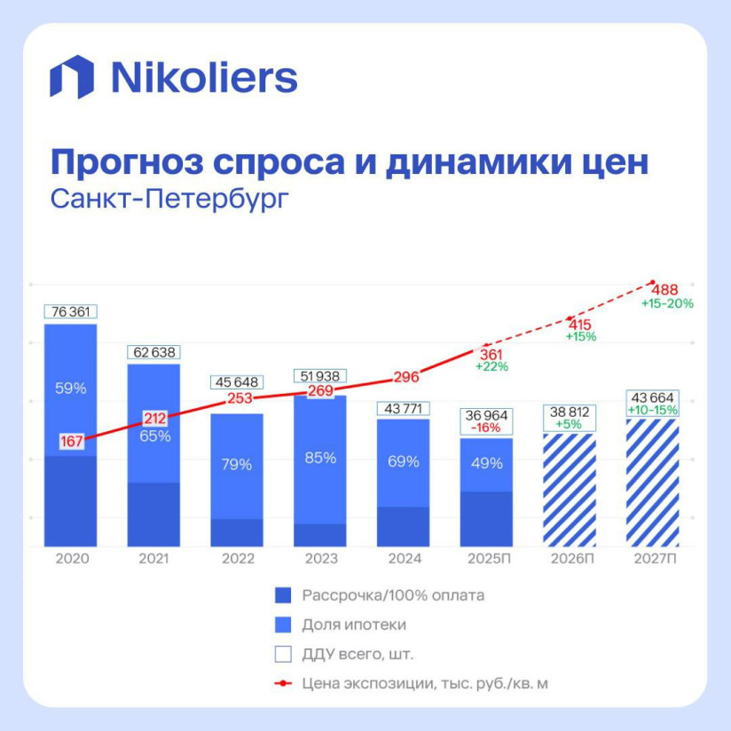 В Nikoliers прогнозируют, что в целом за 2025 год цены на первичное жилье в Петербурге вырастут на 22%. Они связывают это с ростом затрат на проектное финансирование, высокой долей рассрочек, повышением операционных затрат девелоперов и ростом себестоимости строительства.